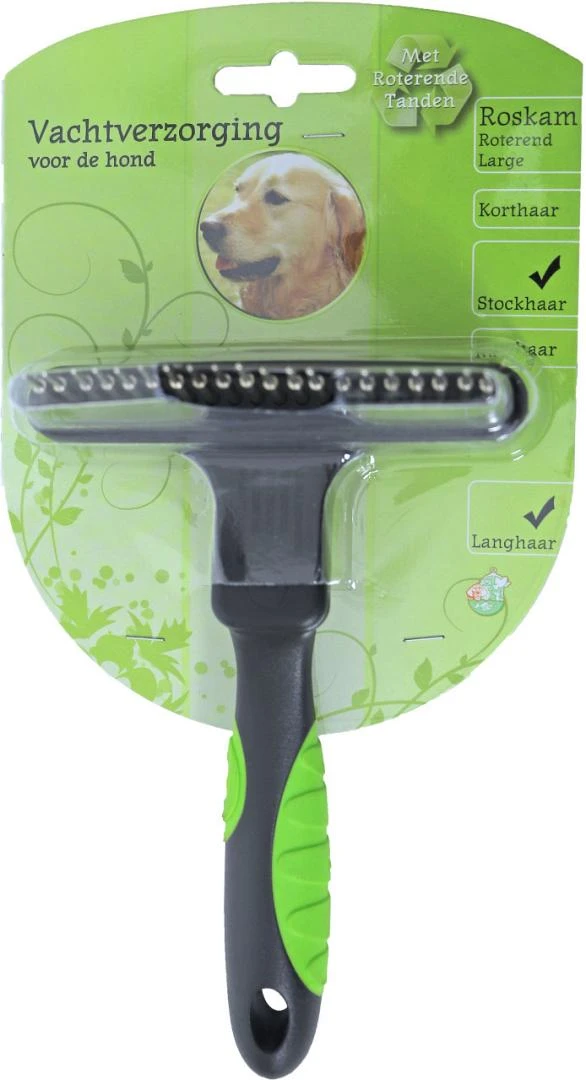 De roskam met roterende pennen largel is uitermate geschikt voor het ontklitten of ontwollen van de vacht. Deze roskam is uitermate geschikt voor alle honden met een lange vacht. Door de ergonomische vorm is deze kam minder belastend voor jouw lichaam, de roterende tanden zorgen ervoor dat de kam gemakkelijker door de vacht glijdt.