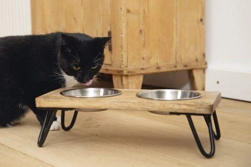 Met de Designed By Lotte Voer- en drinkbak Linga voor de kat, houd je het voer en het water voor je kat altijd netjes bij elkaar. Doordat de voerbakjes iets boven de grond hangen, hoeft jouw kat niet te ver te bukken om te eten en te drinken. Dit zorgt voor een goede houding en eetpositie. De standaard is gemaakt met mangohout, heeft een zeer stoere uitraling en ziet er met de stalen poten bijzonder fraai uit.