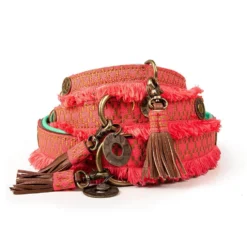 De Dog with a Mission halsband Holly is een prachtige halsband met een messing gesp met reliëf, matchende studs en rand met franjes. Dit maakt de halsband de perfecte mix tussen speels en luxueus.