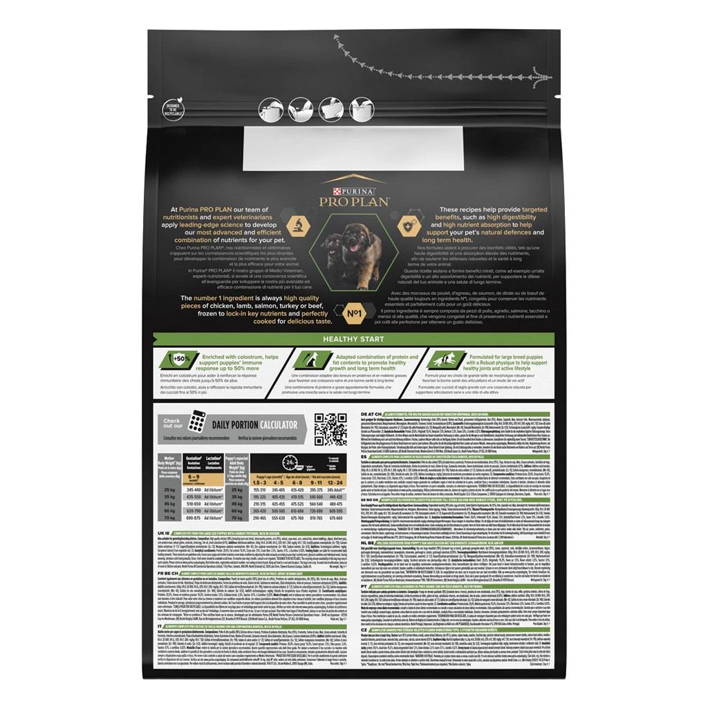 Pro Plan hondenvoer Puppy Large Robust is speciaal samengesteld om te beantwoorden aan de specifieke voedingsbehoeften van grote puppy’s (> 25 kg volwassen gewicht) van 2 tot 24 maanden oud met een robuuste lichaamsbouw zoals de Golden Retriever of Rottweiler.
