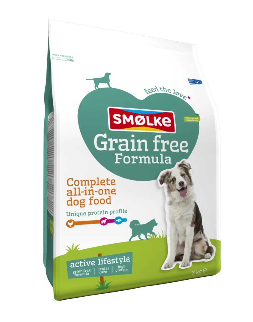 Smølke Adult Grain Free Formula is een complete Alles-in-één graanvrije hondenvoeding afgestemd op de behoefte van volwassen honden van alle rassen.